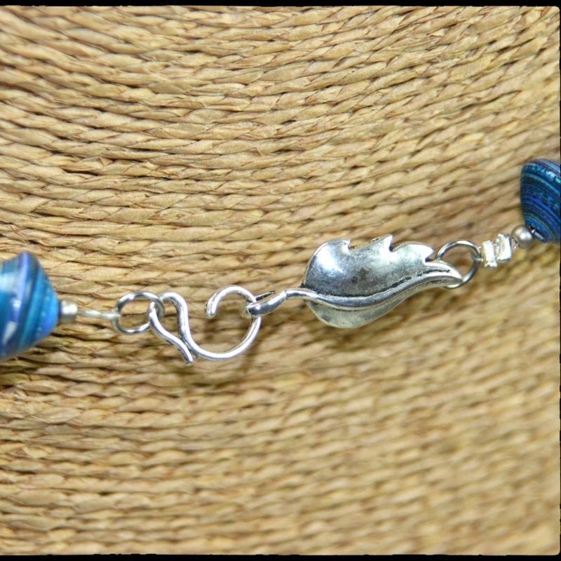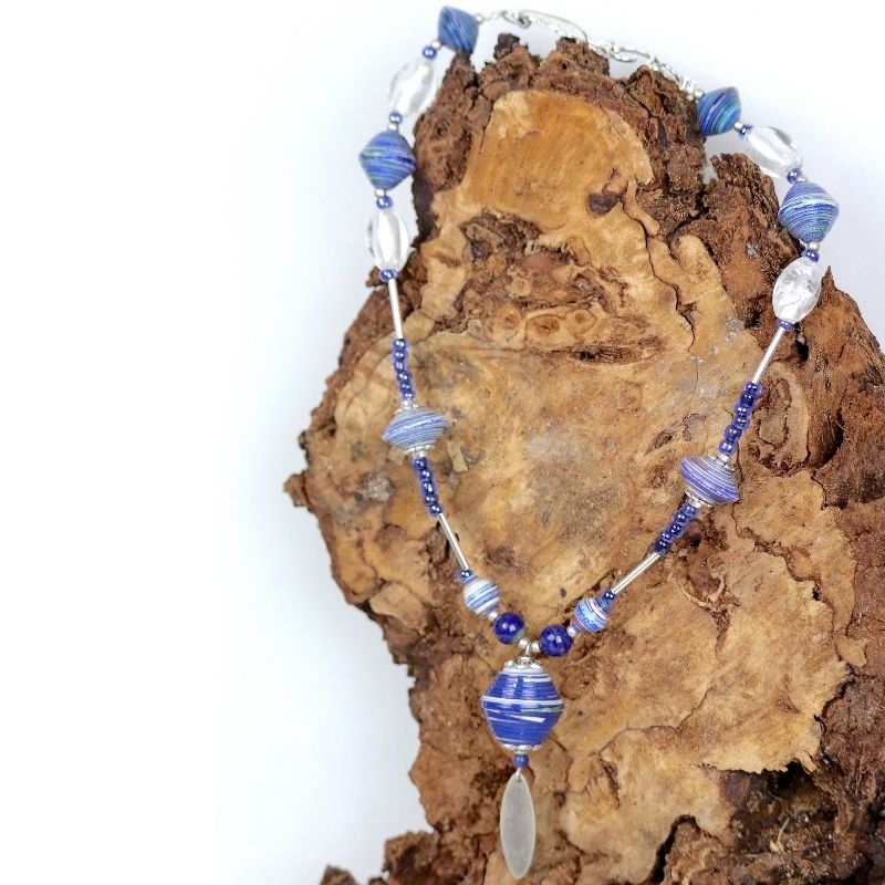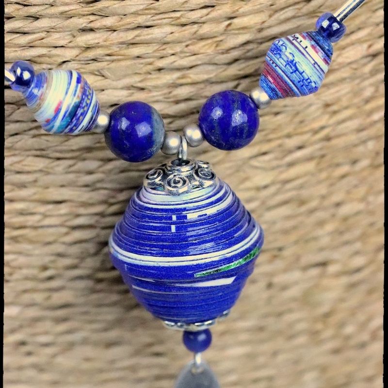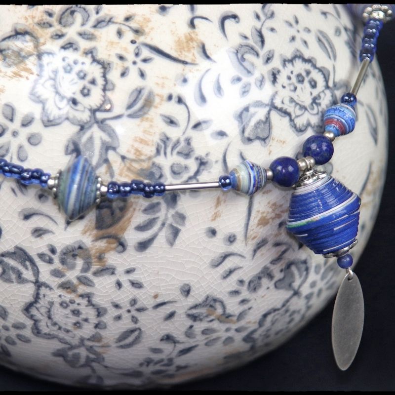 La prédominance du bleu associée à la couleur argentée font de ce collier un bijou raffiné.