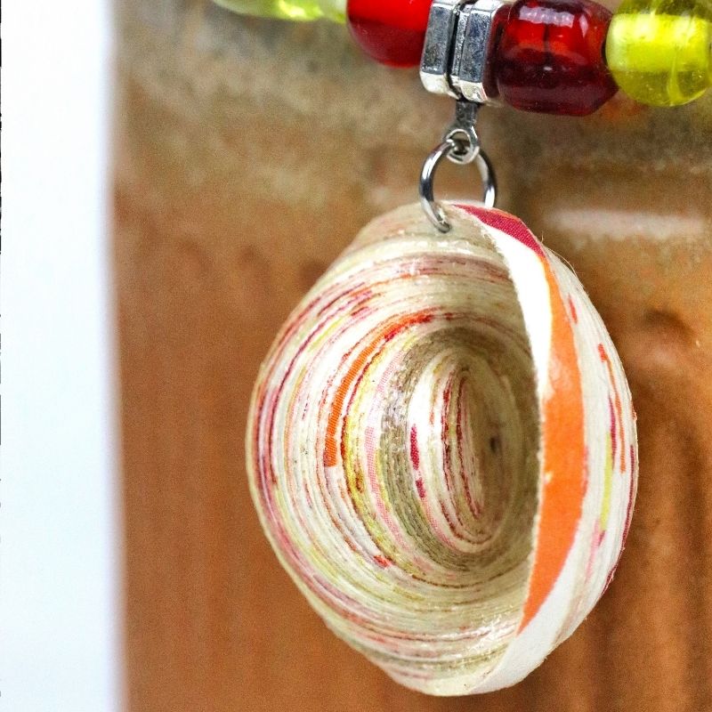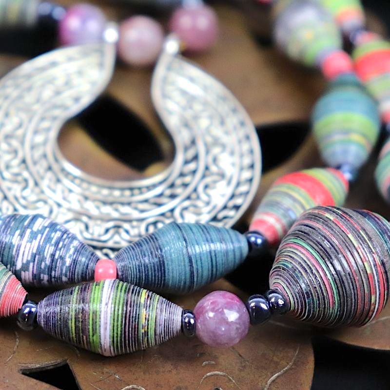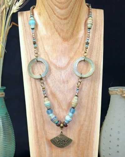 Ici, il s’agit d’un collier aux couleurs bleu perle et beige, composé notamment de deux anneaux en papier.