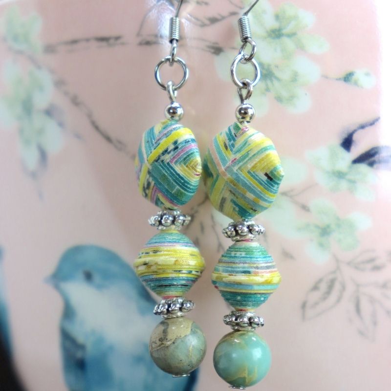 Dans un esprit nature, cette paire de boucles d’oreilles arborent à la fois des couleurs évocatrices du printemps ainsi que des apprêts aux motifs de fleurs.