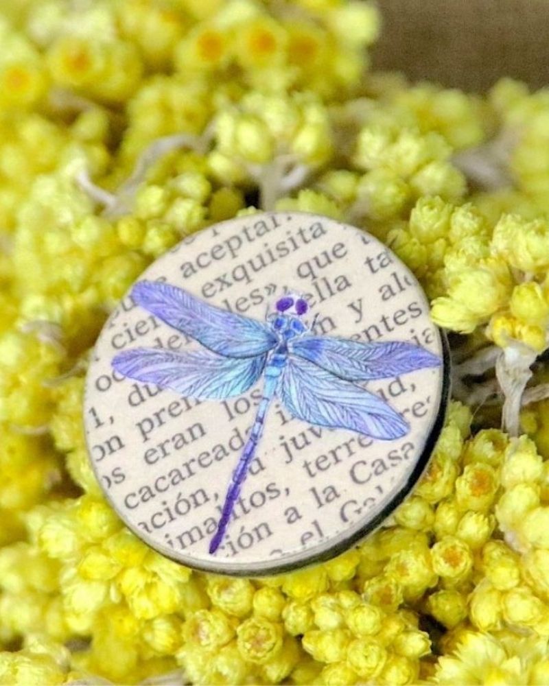 Cette bague arbore une libellule aux tons violets et bleus.